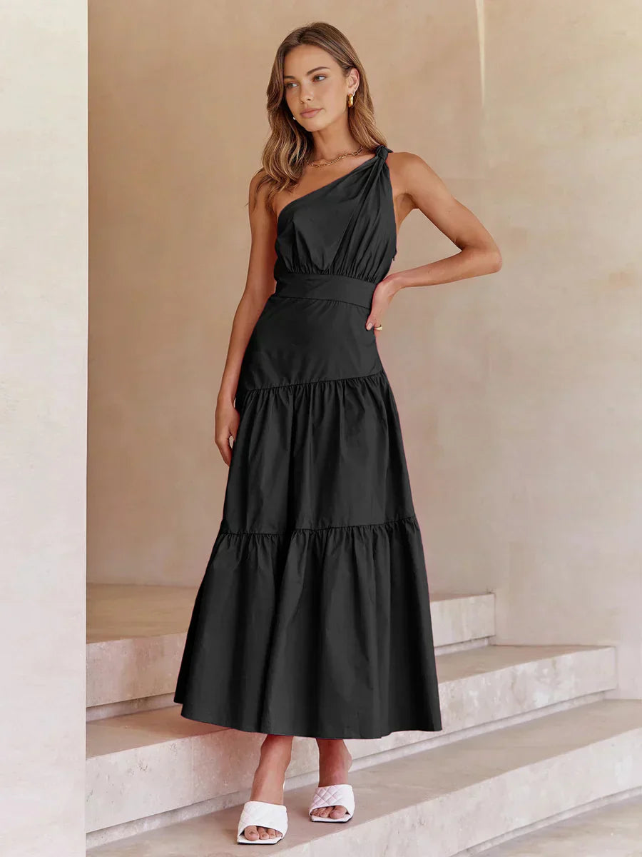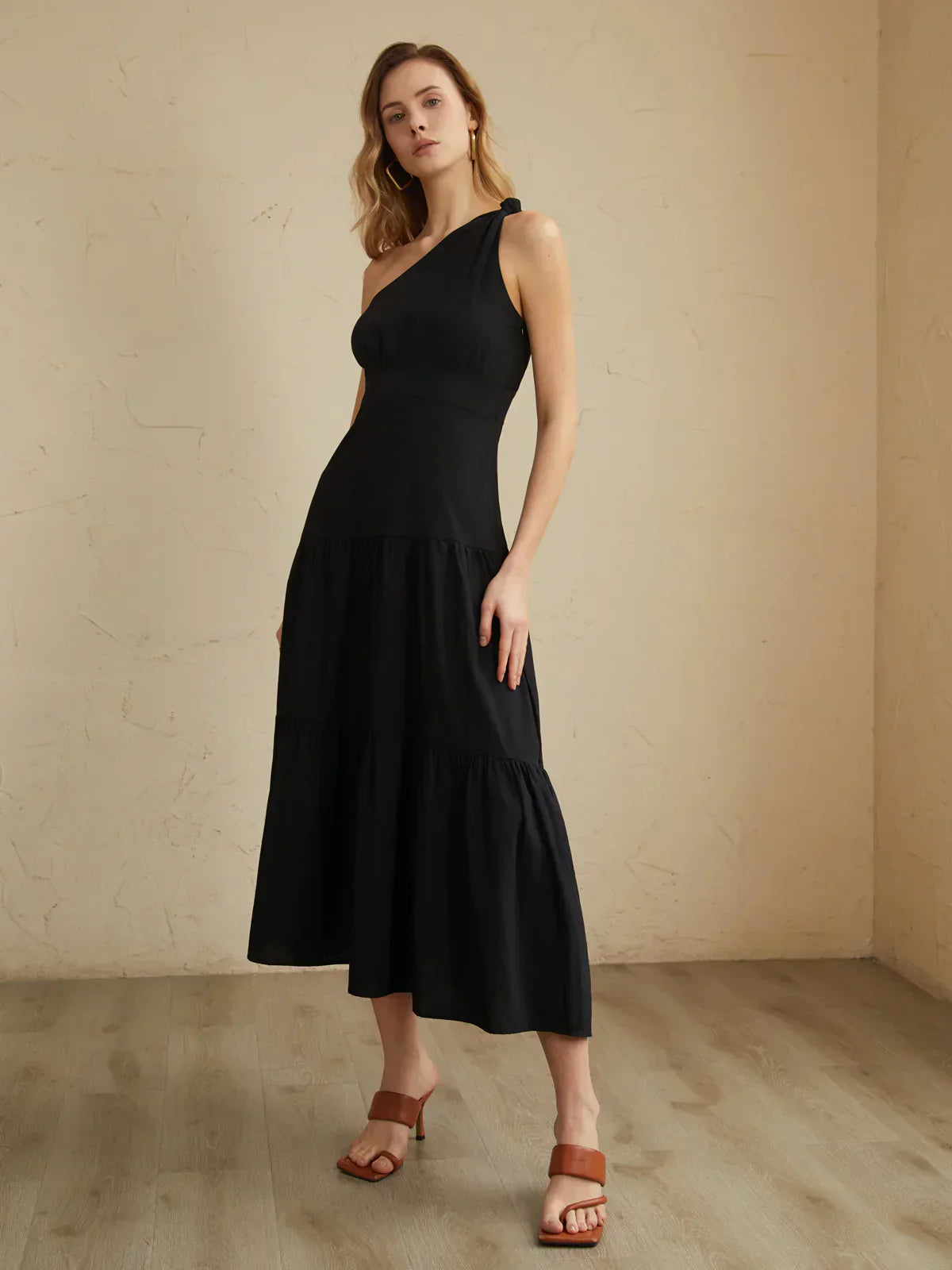 Asymmetric Shoulder Knotted Midi Dress